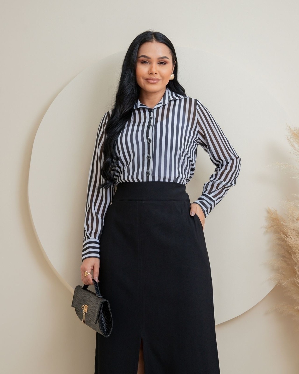 O Conjunto Gabi é a escolha ideal para quem deseja unir elegância e conforto em um único look. Composto por três peças, incluindo uma regata, uma camisa e uma saia sarjada, este conjunto é perfeito para diversas ocasiões, desde um dia no escritório até um evento especial.